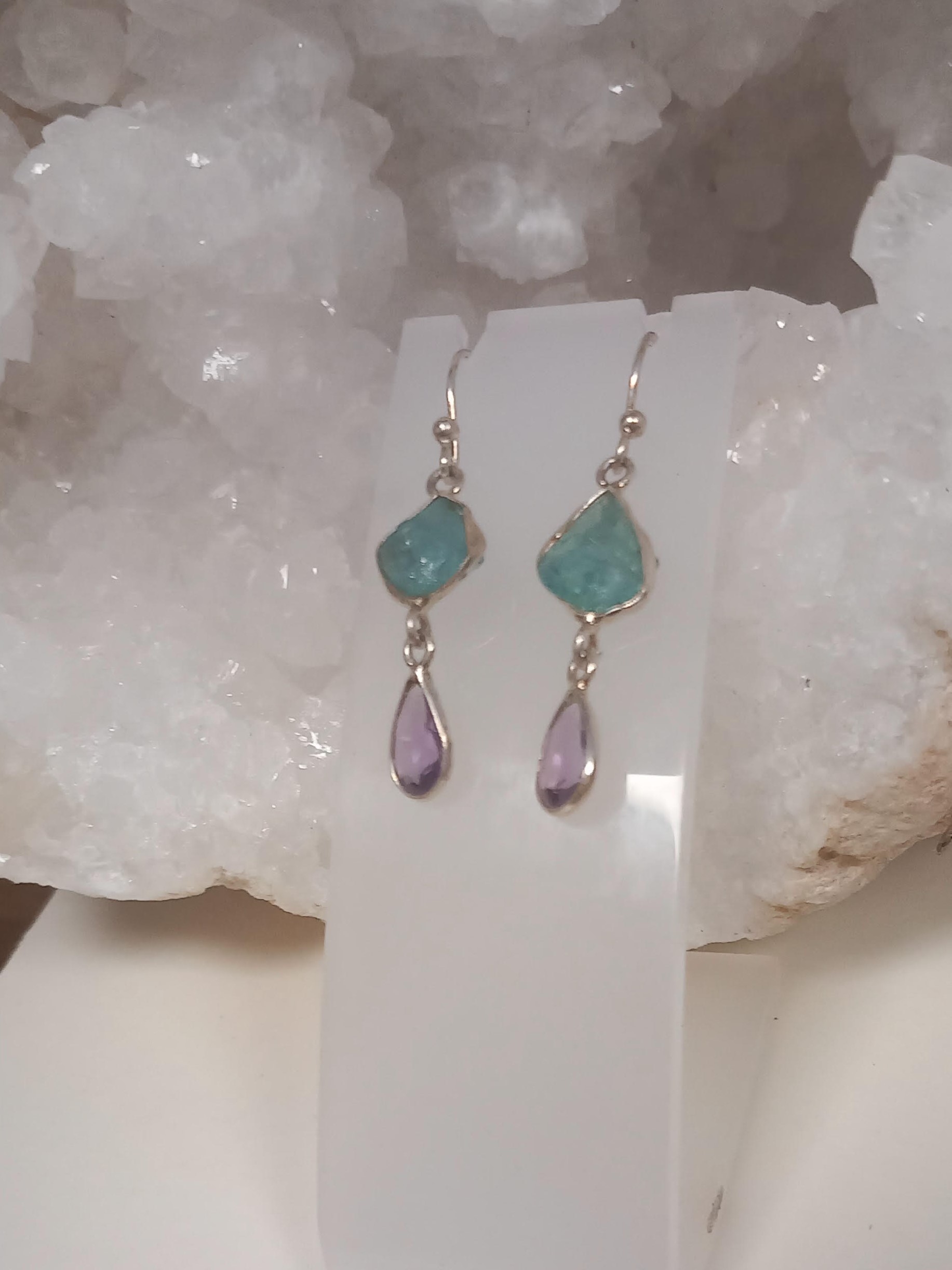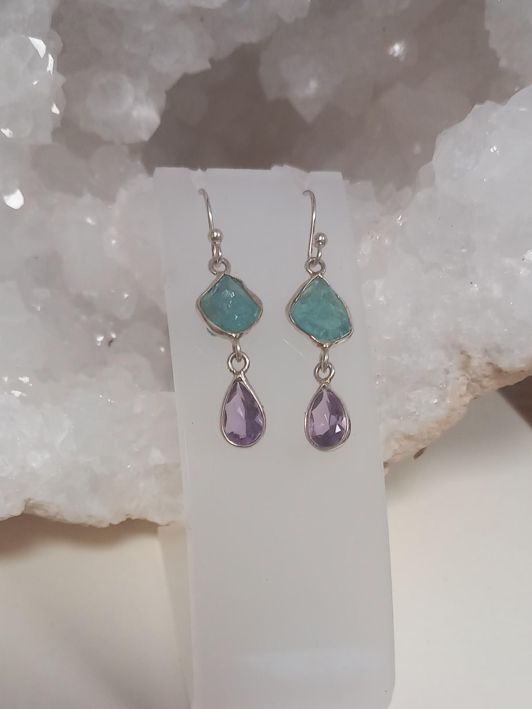 Très jolie boucle d'oreilles longues avec de l'aigue marine et en améthyste sertie sur de l'argent.
