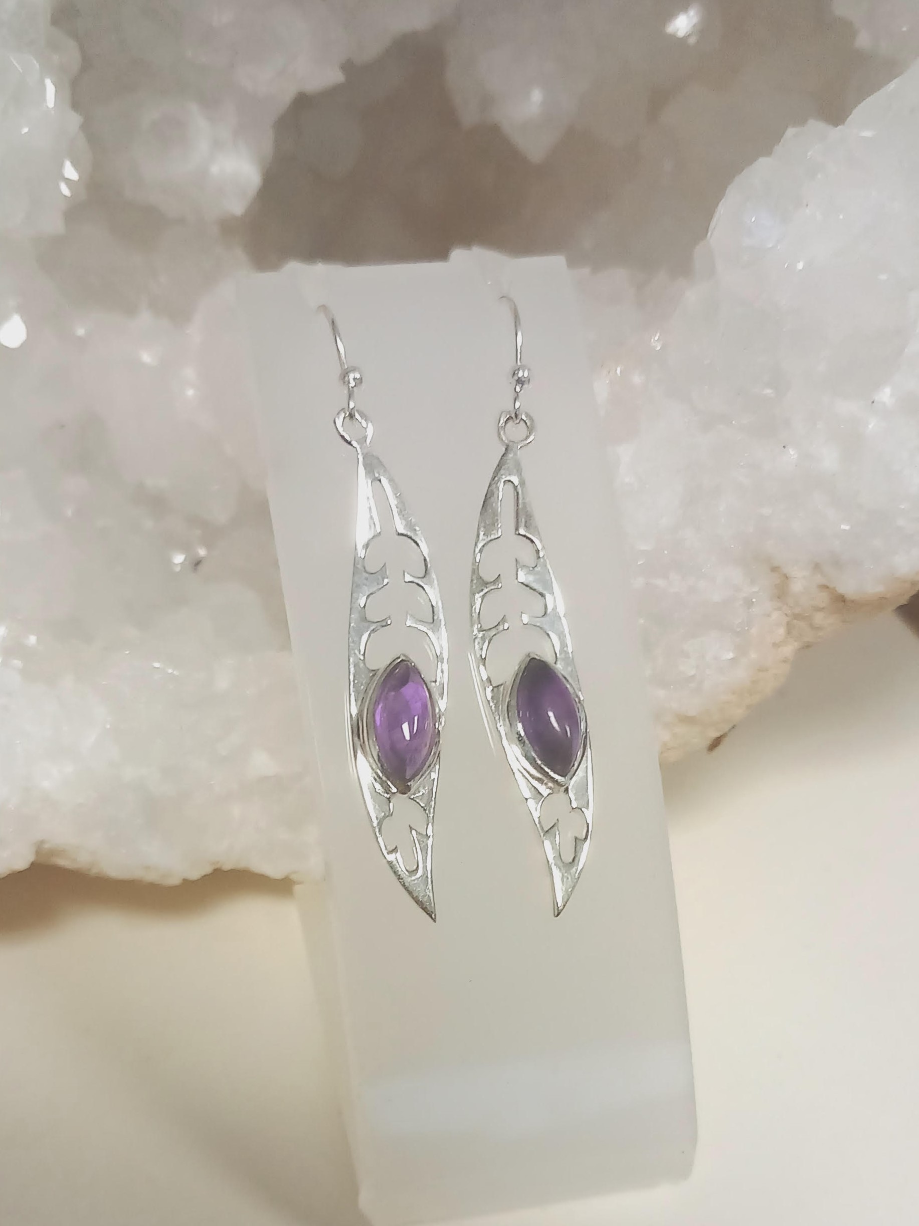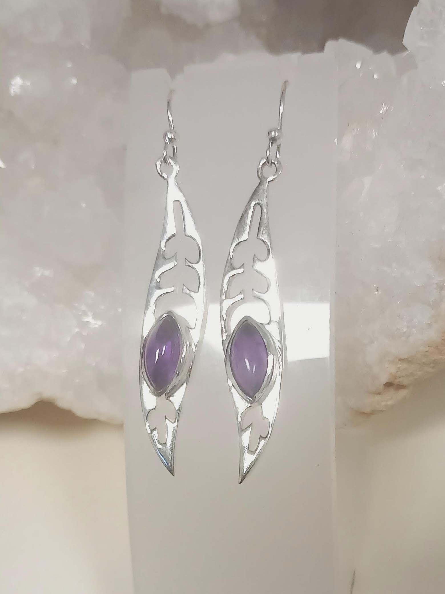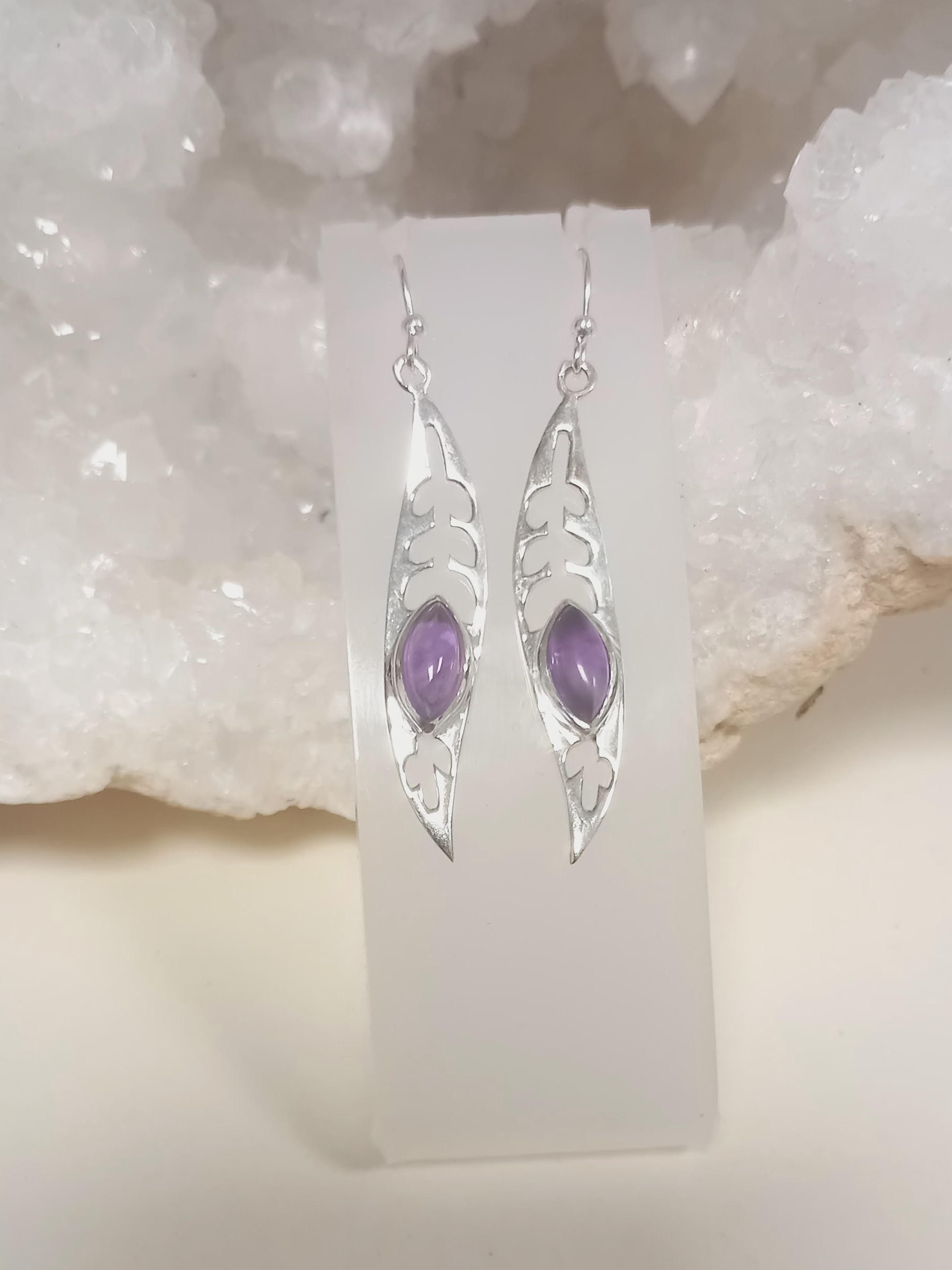Très jolie paire de boucle d'oreilles en améthyste en forme de feuille sertie sur de l'argent 925.